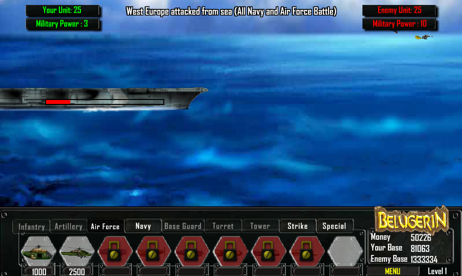 Clique sur Military power+ pour acheter de la puissance pour ton armée : attaque et dommages causés.Tu peux sauvegarder ton jeu en appuyant sur Save/Load