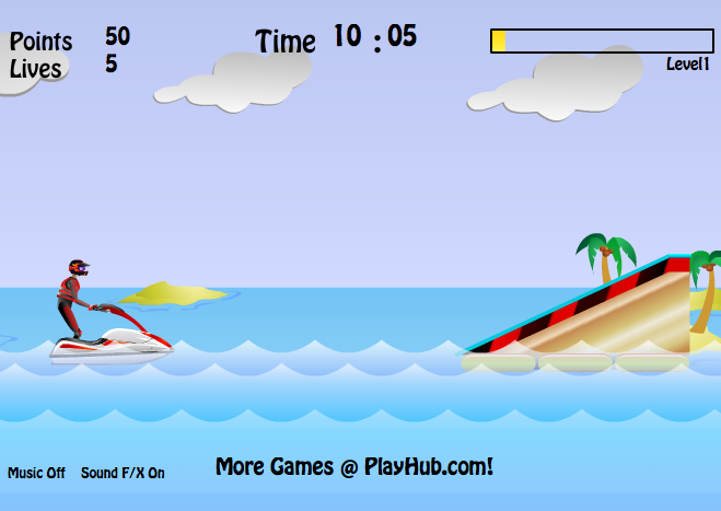 Participe à une folle course de jet ski dans laquelle tu dois finir le parcours en un minimum de temps et obtenir le plus de points possibles.