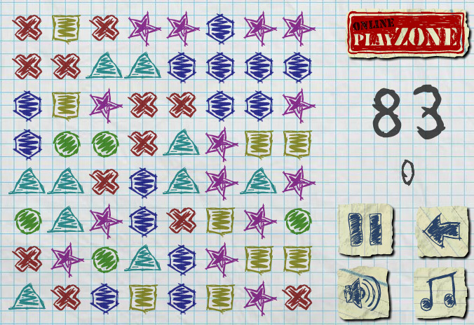 Totalement addictif ce nouveau jeu de réflexion en ligne. Sur le tableau tu dois, à l’aide du clic de ta souris, faire tomber les séries de 3 formes identiques. Plus le nombre de formes identiques que tu fais tomber est grand plus tu gagnes de points. Certaines formes valent le double de points, repère-les vite et fais-les tomber.