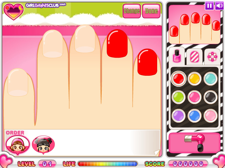 Il est super rigolo ce tout nouveau jeu de maquillage gratuit en ligne. Tu tiens un salon de beauté et tu dois faire la beauté des mains de tes clientes. Pour jouer clique sur « order » et reproduis à l’identique le modèle qui t’es proposé en haut et à droite de ton écran. N’oublie pas de bien sécher tes ongles avec le sèche-cheveux. Pour appliquer le vernis, clique et glisse ton pinceau sur les ongles de ta cliente.